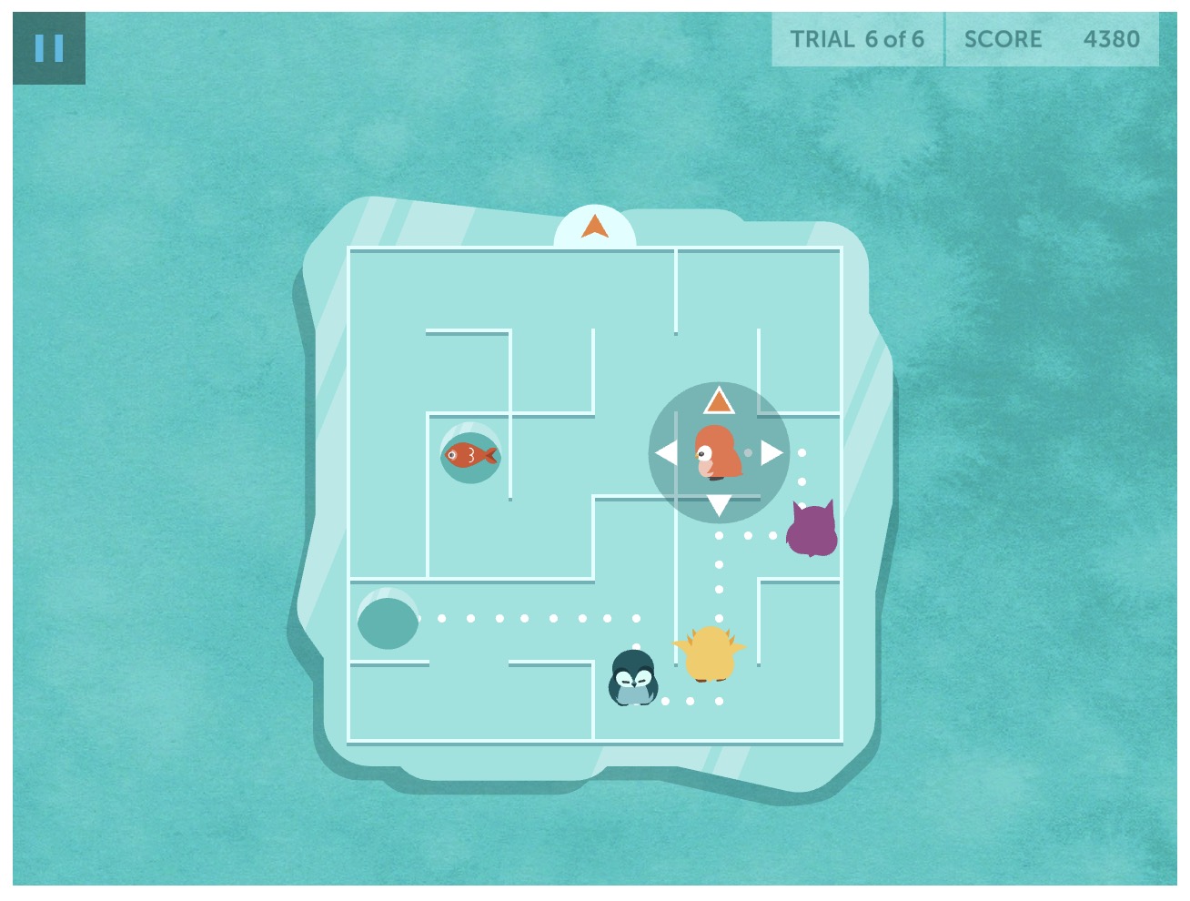 In a “Time Trial” your penguin races against the clock, earning bonus points for any seconds left on the timer when the penguin reaches the fish (but you can take as long as you need to finish the maze). Time Trials are meant to help you practice navigating the rotating maze without the pressure of competing against other penguins.