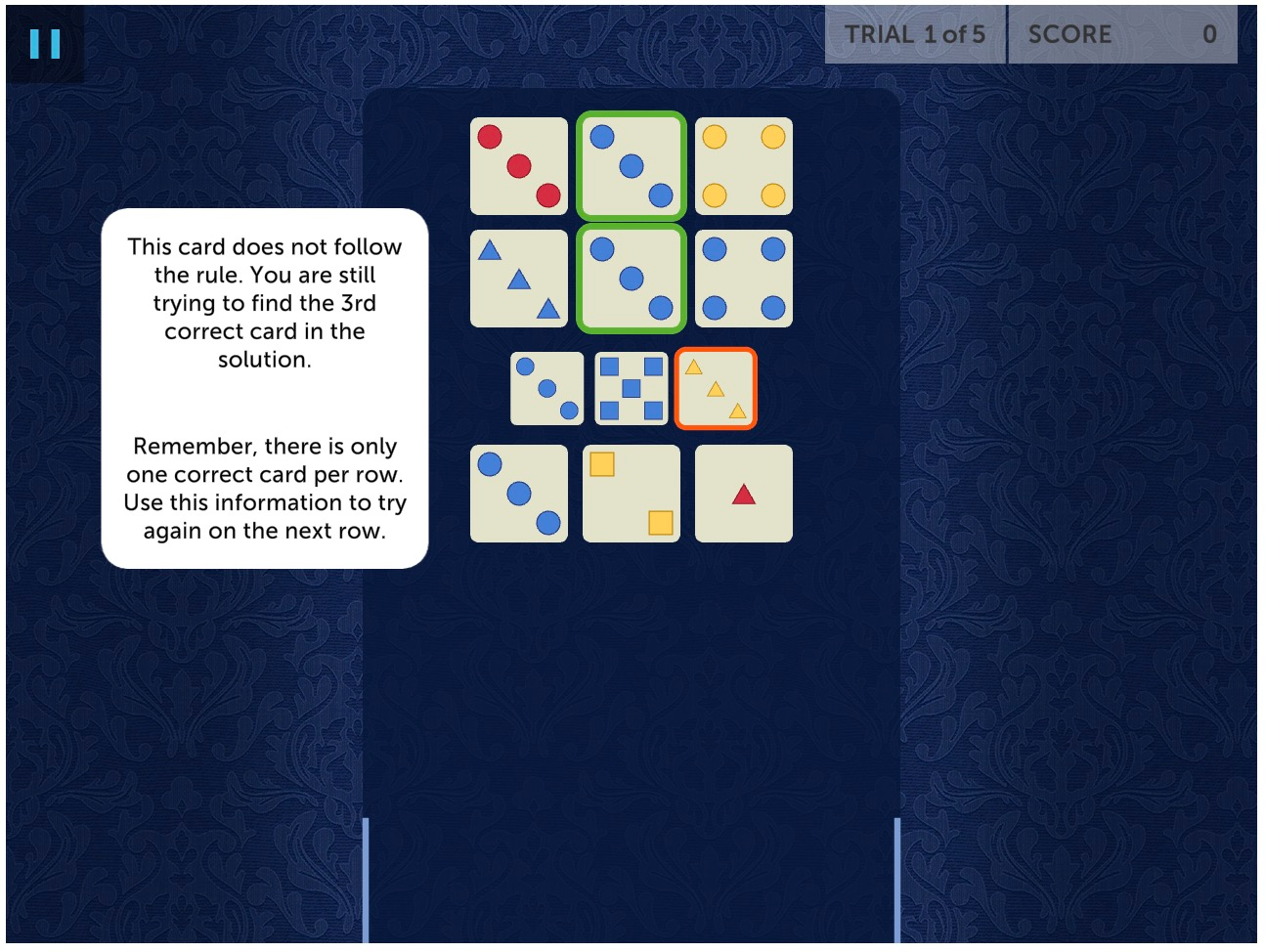 Your performance in Ruled Out is measured based on whether or not enough information has been given to make a correct decision for the current row. For example, if the card you selected was marked incorrect but matched a different rule that still existed as a possibility for the trial, your performance will not be impacted. (In this game, wrong guesses can be a necessary part of figuring out the solution!)