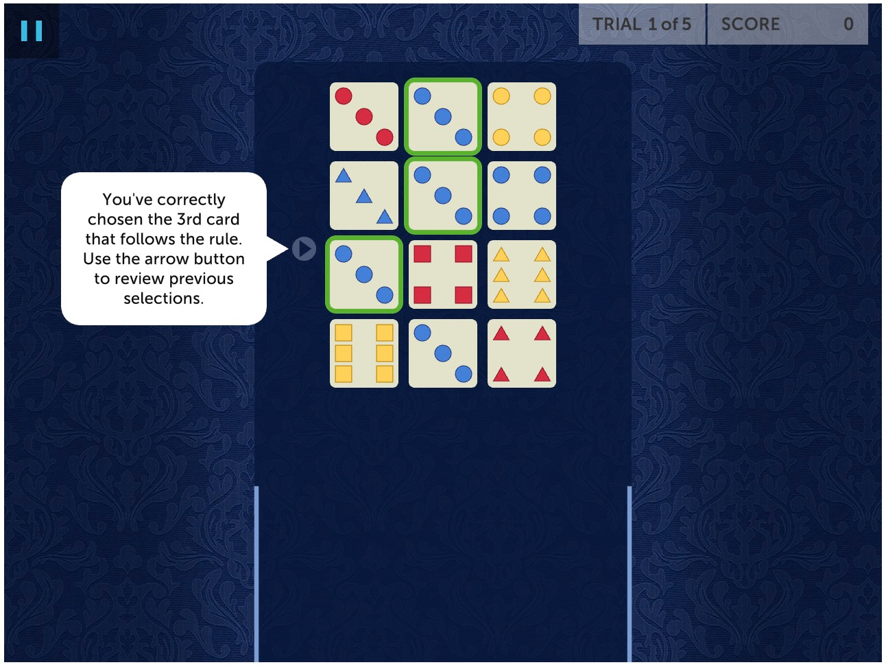 When the next row appears, try to select the card in that row you think follows the secret rule. Use the information in the first row to help you decide. Then continue selecting one card per row.