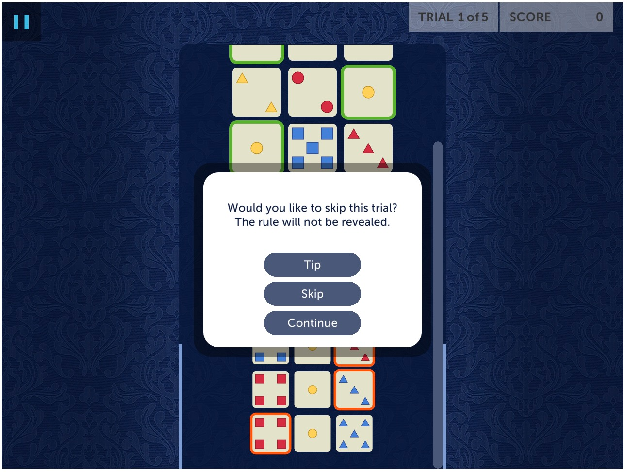 If you get enough incorrect answers in a row, a pop-up window will appear asking if you want to skip the current trial and move on to the next one. If you decide to skip, the rule will not be revealed to you. The pop-up also gives you the option to read a Tip that might help you figure out the rule. There is no penalty for reading a Tip.